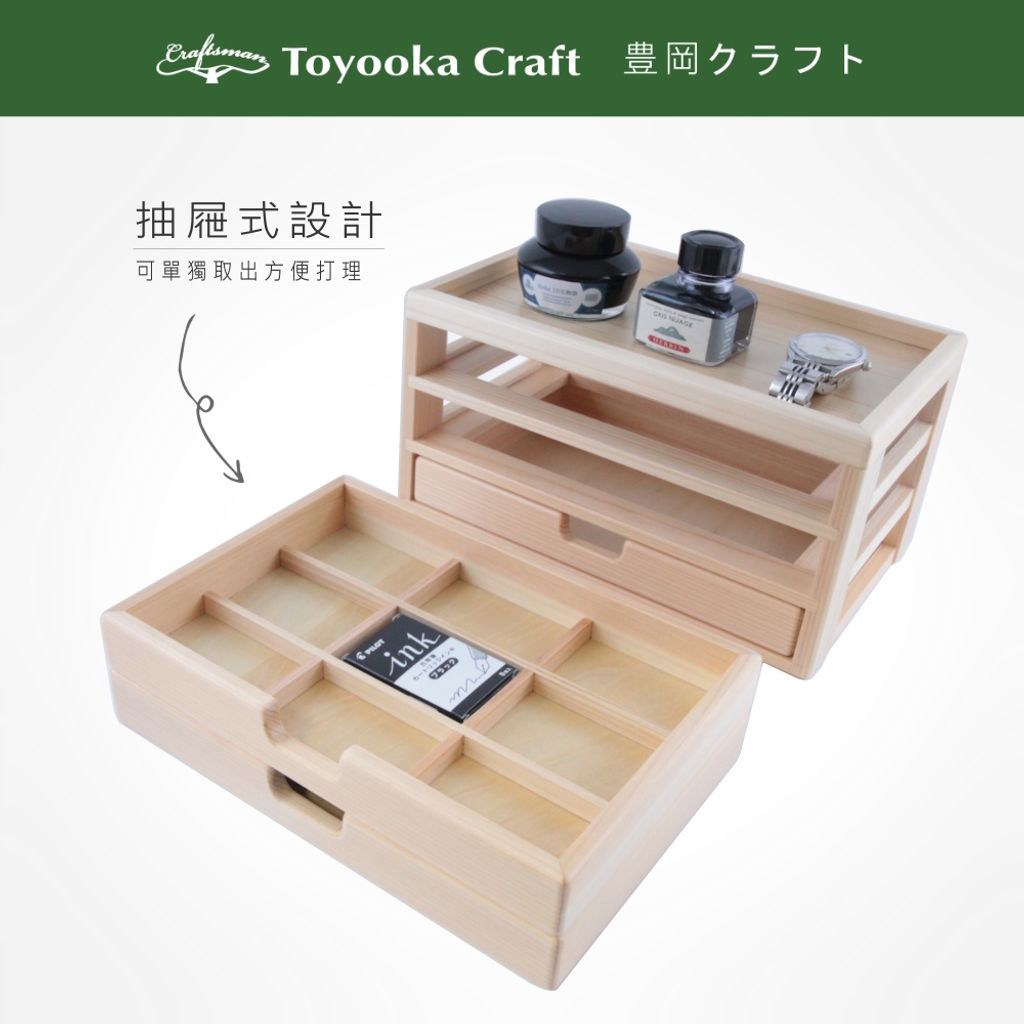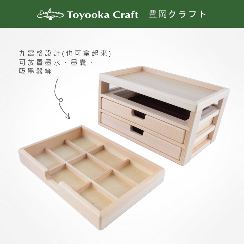 上層可放置眼鏡、手錶等配件,三層收納盒共可放置18支鋼筆,第一層抽屜也可放九宮格木格板,以放置墨水、墨囊、吸墨器等,抽屜內筆盤非固定式,可當筆盤或翻面當平面盤使用。